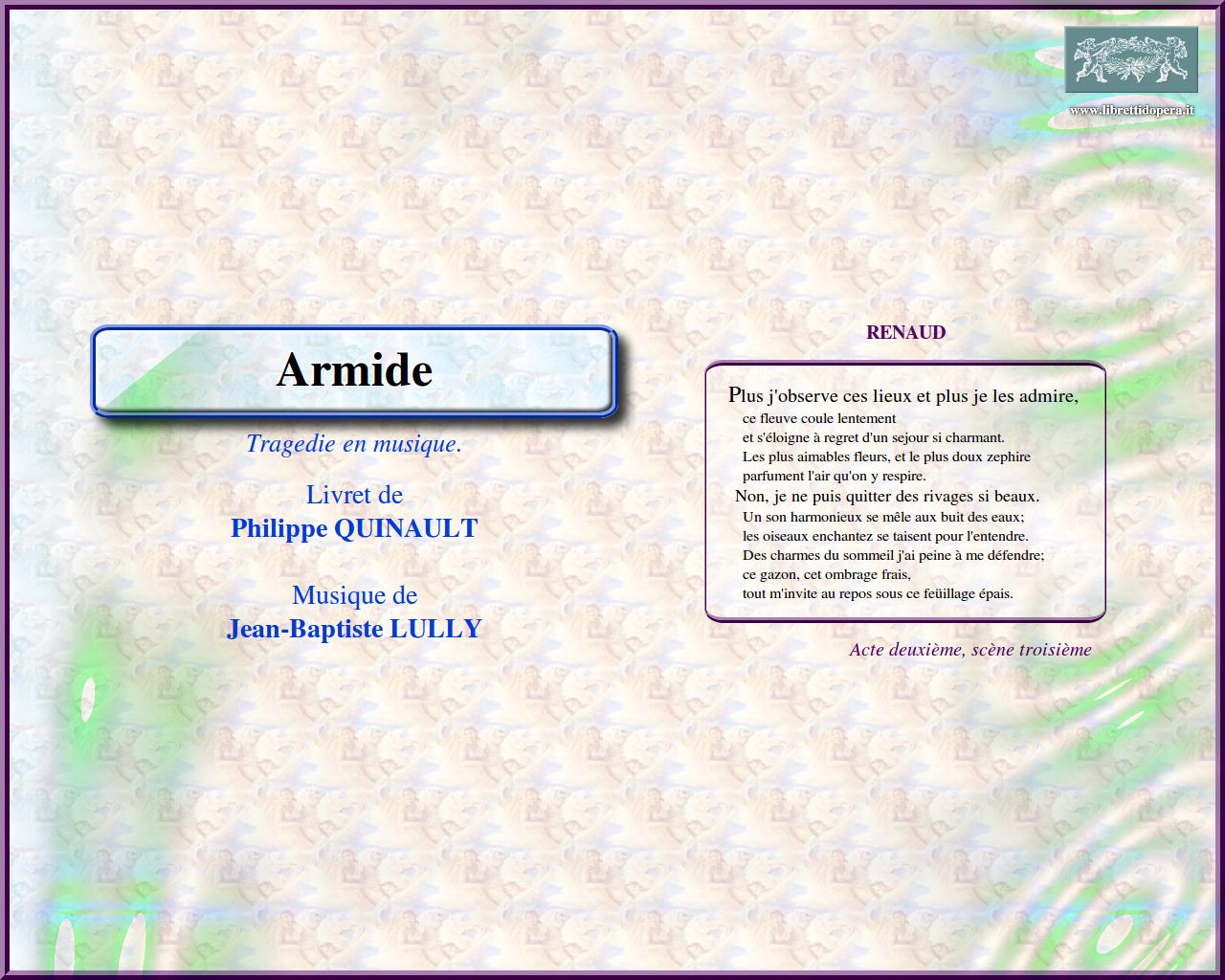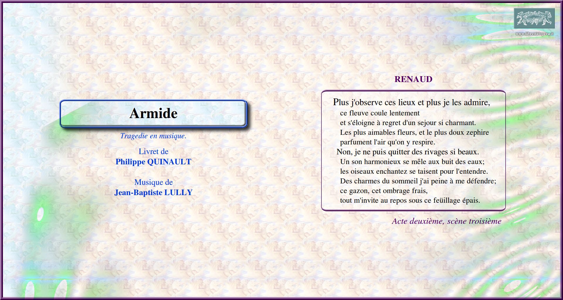 Un songe affreux m'inspire une fureur nouvelle Plus j'observe ces lieux et plus je les admire Le perfide Renaud me fuit
