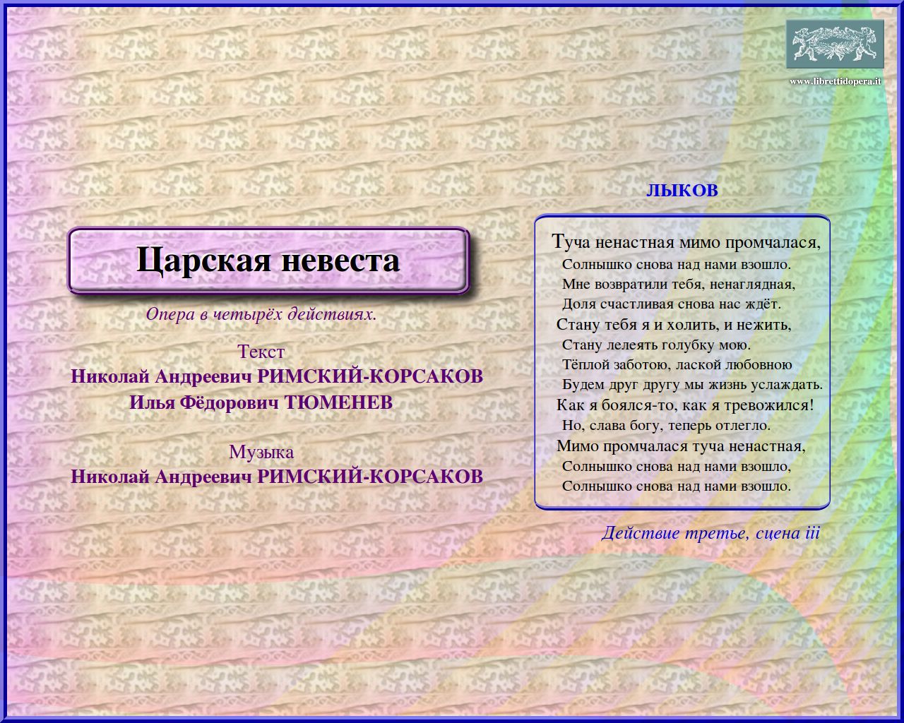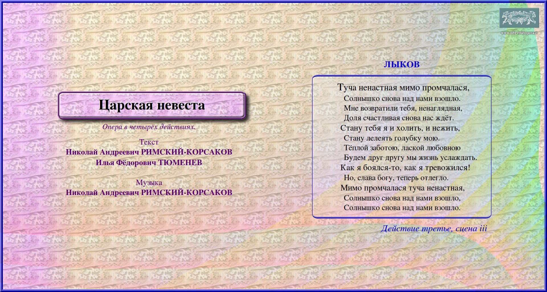 Снаряжай скорей, матушка родимая В Новгороде мы рядом с Ваней жили Туча ненастная мимо промчалася Иван Сергеич, хочешь в сад пойдём?