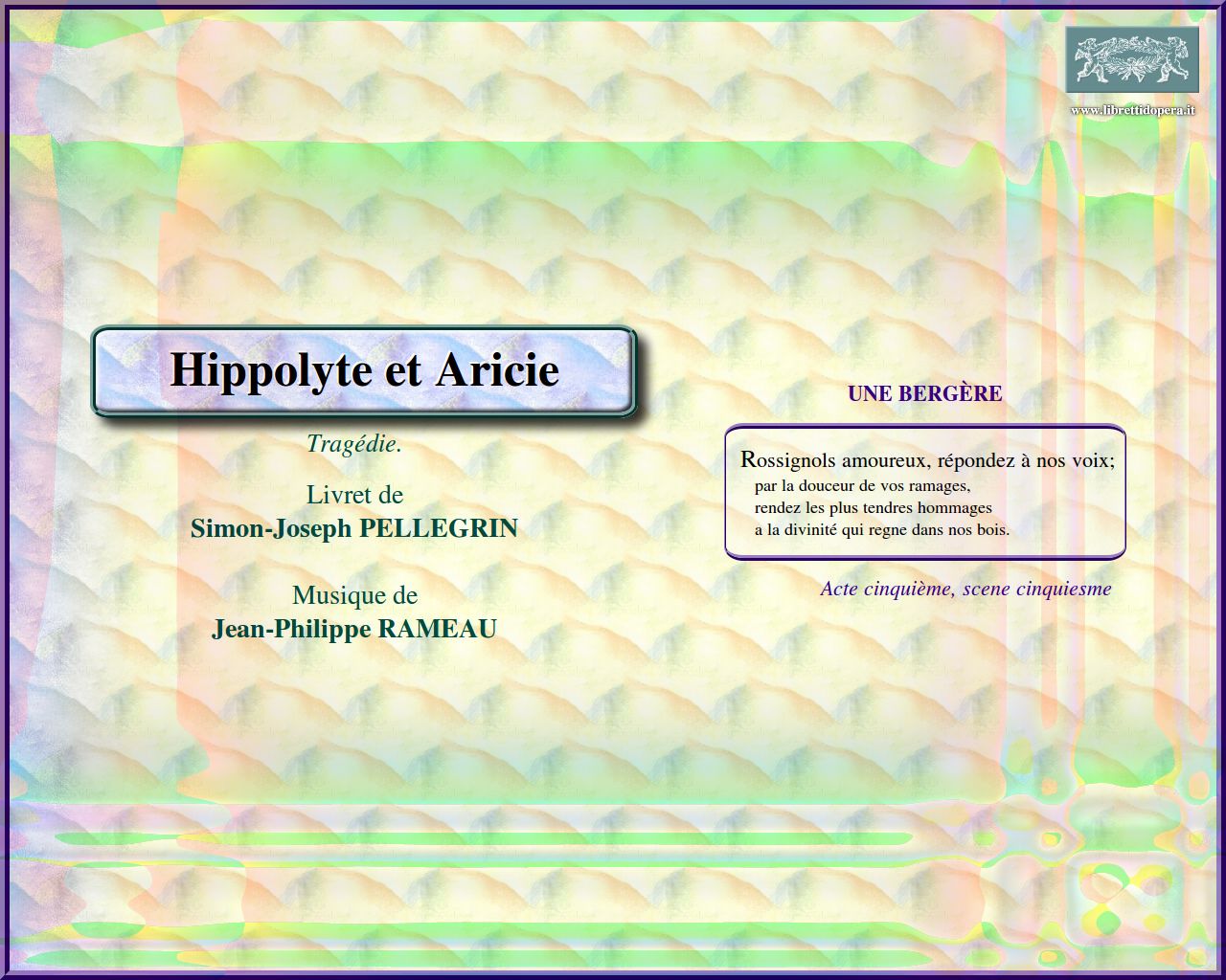 Temple sacré, séjour tranquille Quelle soudaine horreur ton destin nous inspire? L'amour, comme Neptune Faisons par tout voler nos traits Rossignols amoureux, répondez à nos voix