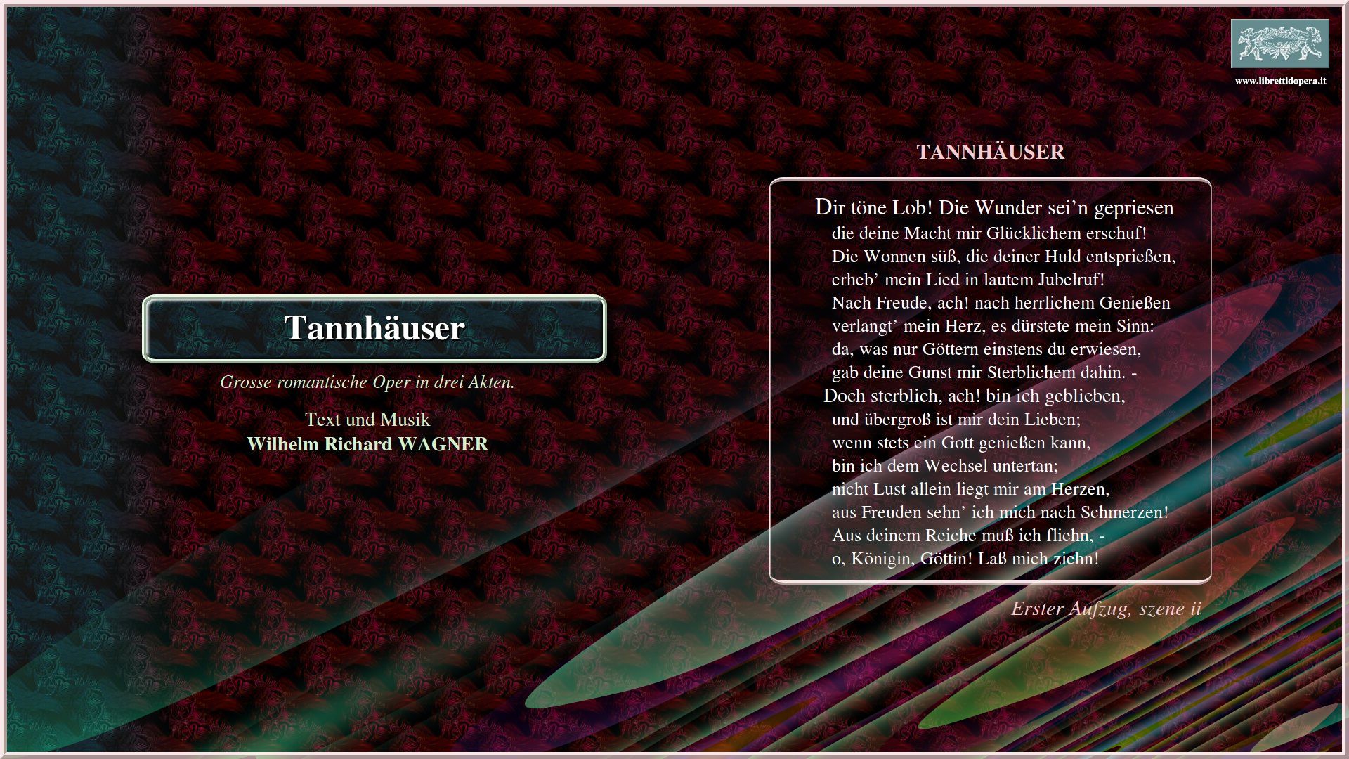 Dir töne Lob! Die Wunder sei’n gepriesen Blick’ ich umher in diesem edlen Kreise Allmächt’ge Jungfrau, hör’ mein Flehen!