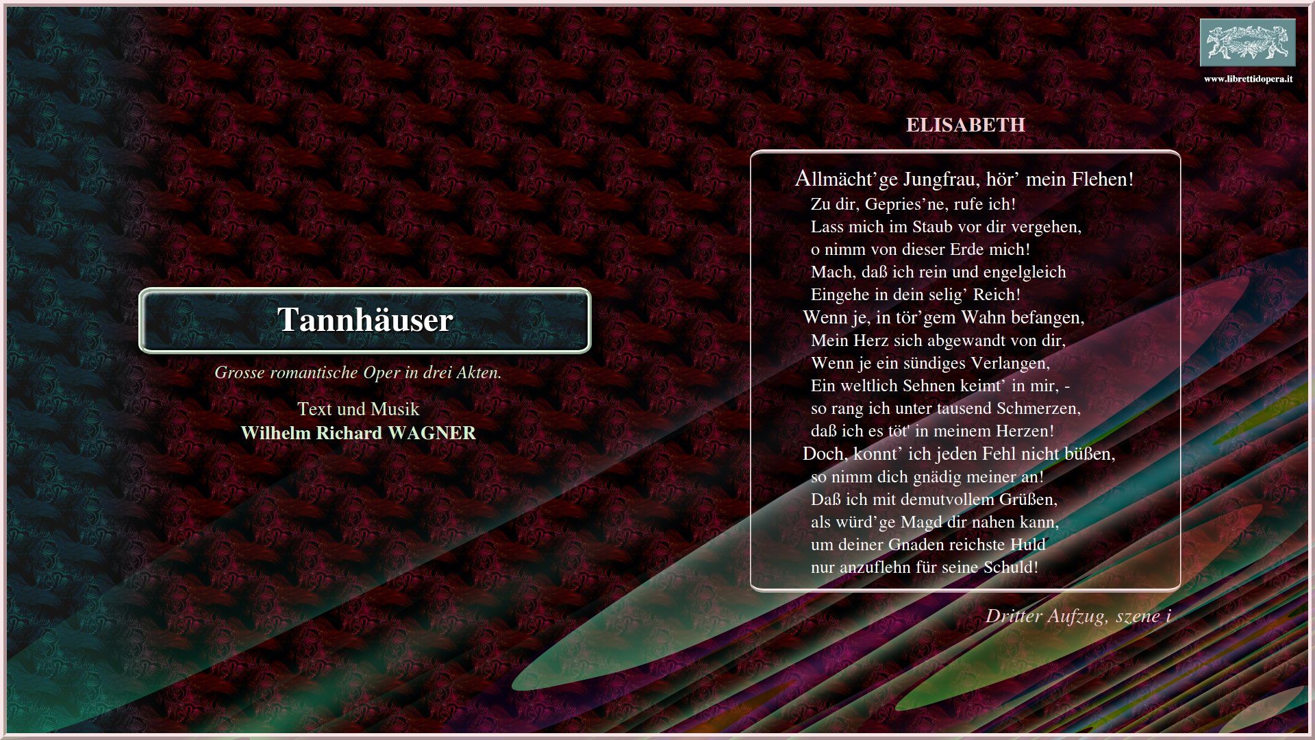 Dir töne Lob! Die Wunder sei’n gepriesen Blick’ ich umher in diesem edlen Kreise Allmächt’ge Jungfrau, hör’ mein Flehen!